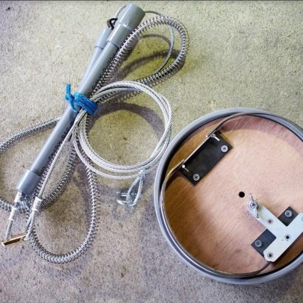 踏み板+スプリング一式となった完成品。獣が踏み板に乗ると、ワイヤロープの輪が真上に飛びあがって、獣の足の上部を捕える仕様。(※設置には免許が必要です)